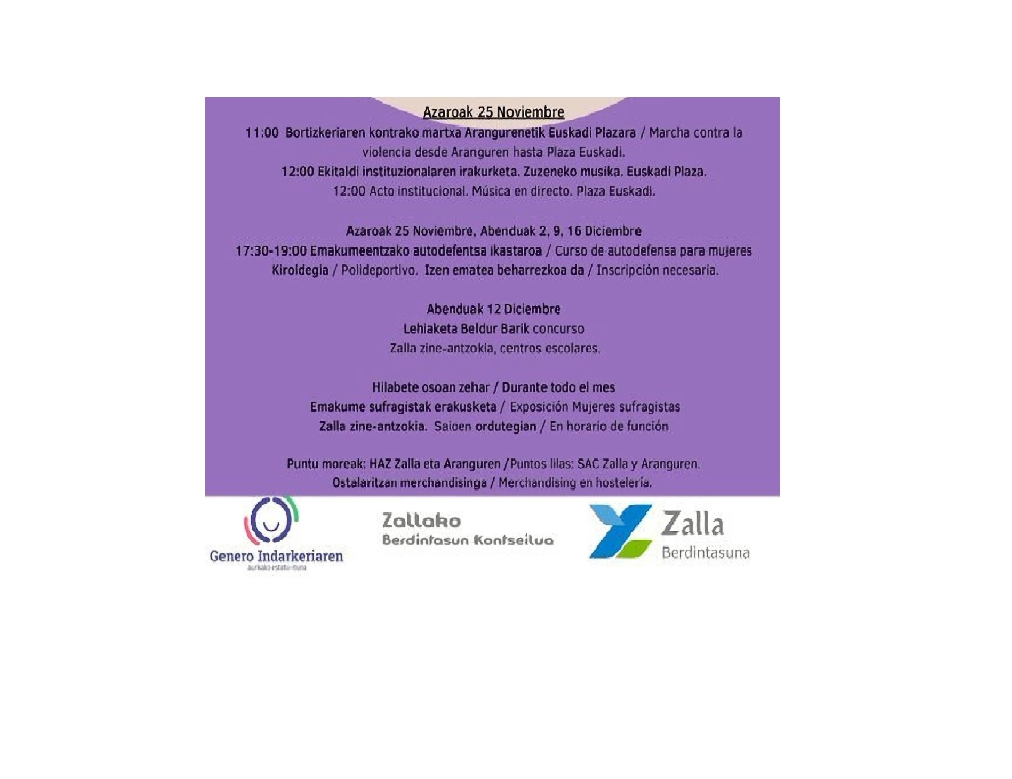 El ayuntamiento de Zalla ha organizado actividades, durante los meses de noviembre y diciembre, para conmemorar el 25N. Entre otras, ya se ha llevado a cabo el cuentacuentos "Super ni" en centros escolares. Además, la asociación de mujeres Entzutekoak y el colectivo feminista Lanbroa también se han sumado a esas actividades ya realizadas con dos charlas.