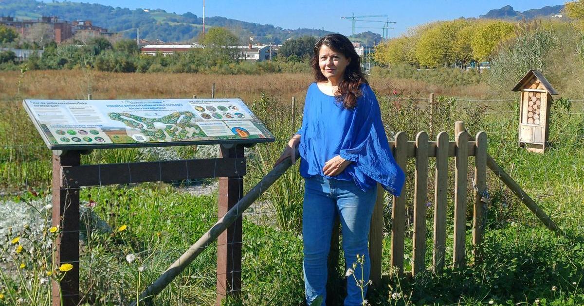 Gloria Vazquez junto al nuevo panel informativo en el humedal de Irita en Zarautz.